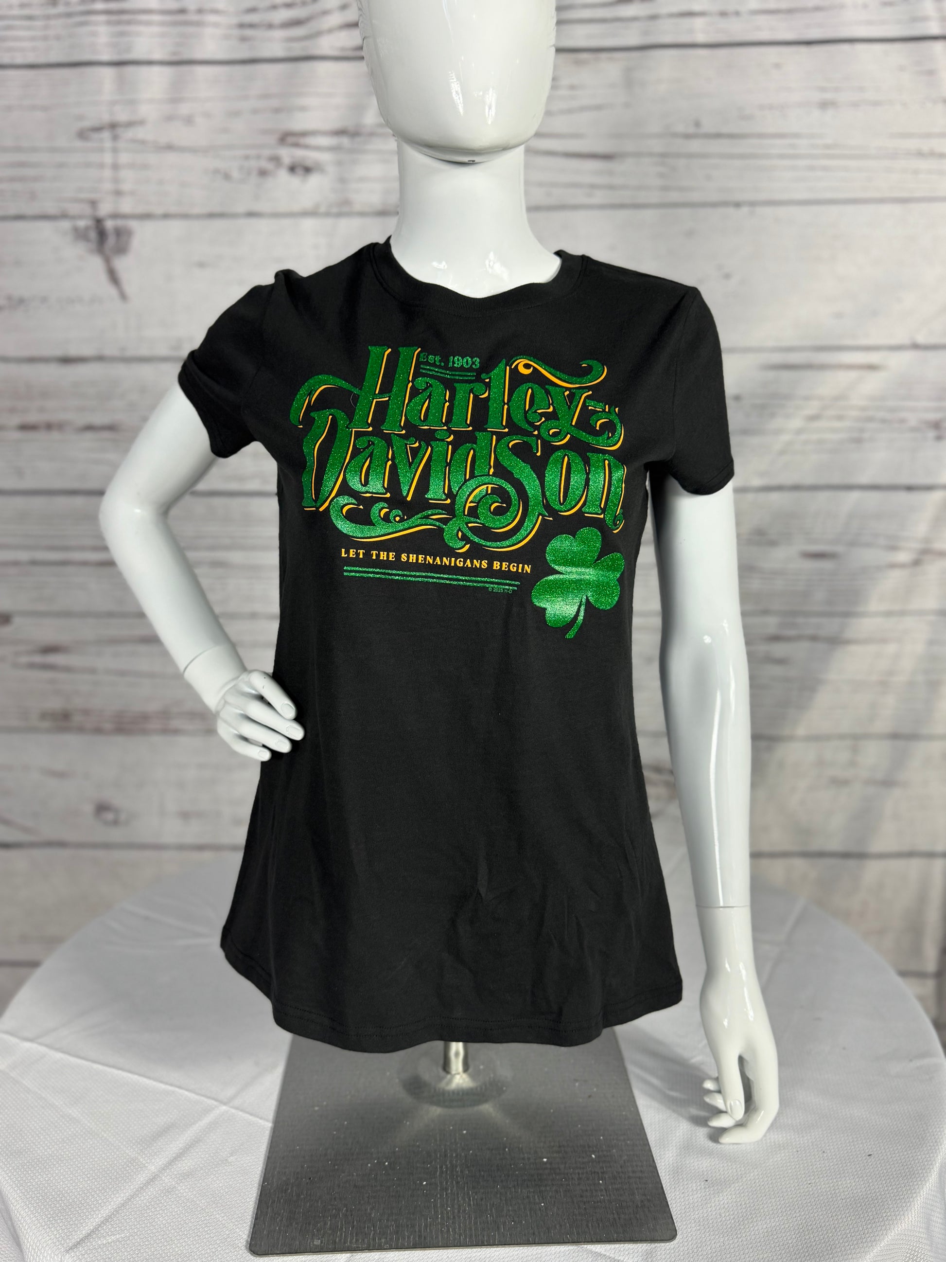 Celebrate St. Patrick's Day in style with the Harley-Davidson® Women's Shanigan Short Sleeve T-Shirt. Featuring shimmering green ink on the front, this tee adds a touch of sparkle to your St. Paddy's Day festivities while showcasing Harley® spirit. Crafted from soft, breathable cotton, it offers all-day comfort and a flattering fit. The back proudly displays our custom Blue Ridge Harley-Davidson® logo, making this tee the perfect combination of festive flair and classic Harley® pride.