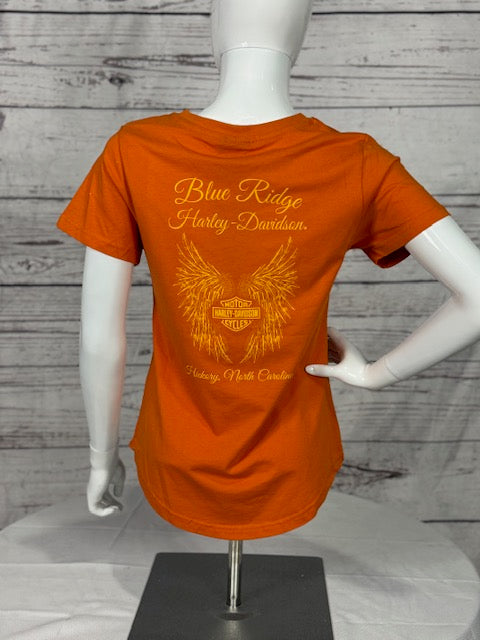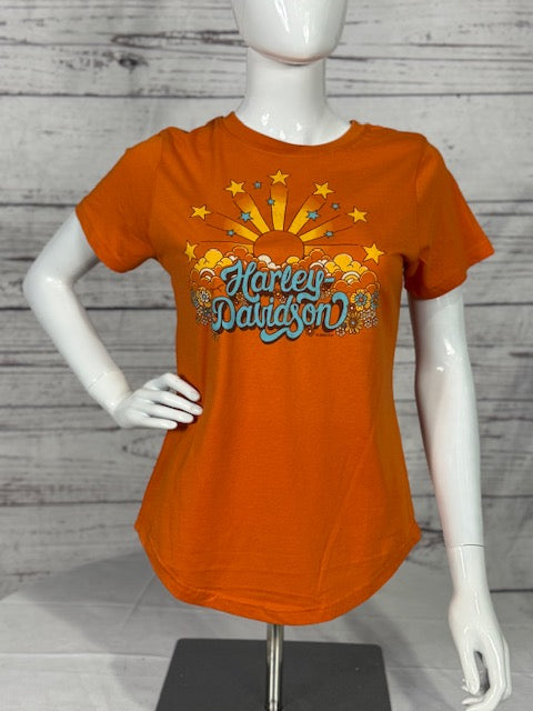 Bring the sunshine with the Harley-Davidson® Women’s Shine Short Sleeve Tee. Featuring a radiant retro front graphic with a glowing sun, groovy florals, and Harley-Davidson® lettering in cool blue, this tee delivers major vintage energy with a playful twist. The bold orange background adds eye-catching warmth, while the soft cotton fabric keeps you cool and comfortable from ride to rally. The back proudly displays our custom Blue Ridge Harley-Davidson® logo with fiery wing details and “Hickory, North Carolina” script, making it a must-have for any Harley® fan with a love for bold colors and throwback vibes.