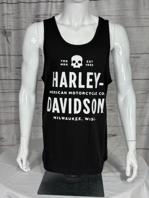 Own the heat with the Harley-Davidson® Men’s Skull Stack Tank. This black tank brings raw attitude front and center with bold stacked lettering, a skull graphic, and vintage Milwaukee callout. Perfect for warm rides or layering under your favorite jacket, it’s built for comfort without sacrificing edge. The back amps it up with our exclusive Blue Ridge Harley-Davidson logo, making it the ultimate piece for repping your dealership in true Harley® style.