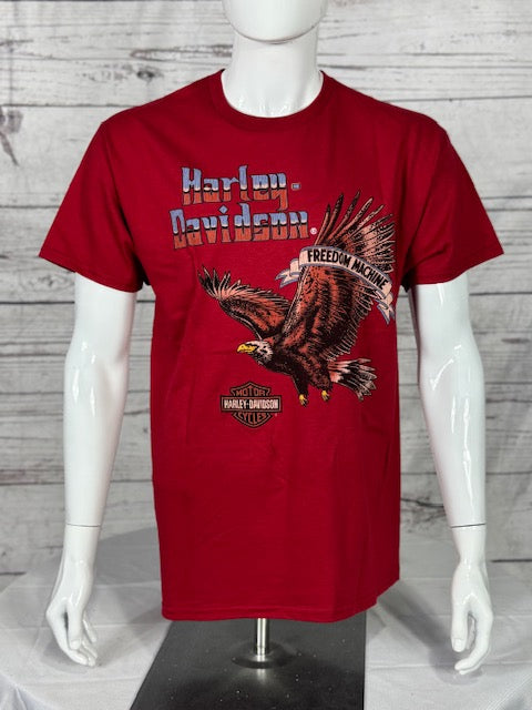 Featuring a fierce eagle mid-flight and “Freedom Machine” banner across the chest, this tee screams untamed spirit and raw American pride. The distressed Harley-Davidson® logo adds grit to the bold red backdrop. On the back, our custom Blue Ridge Harley-Davidson® logo takes center stage, complete with V-twin power and chain-ring detail—ready to ride or die. A must-have for any rebel who lives wide open.