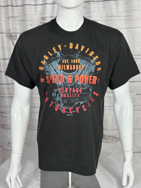 Bring the raw power of Harley-Davidson® heritage to your everyday look with the Men’s Speed & Power Tee. The bold black backdrop sets off a striking vintage engine graphic, paired with fiery orange and red lettering that declares your love for speed, strength, and the open road. Crafted from a comfortable 50/38/12 poly/cotton/rayon blend, it delivers softness with durability built for the ride. On the back, our exclusive Blue Ridge Harley-Davidson logo makes this tee more than just gear—it’s a statement of loyalty. Rugged, breathable, and full of attitude, this one’s a must-have.