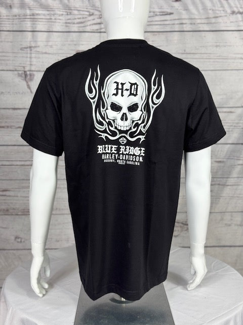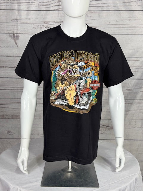 Get wild with the Harley-Davidson Squatchy Tee, a bold black shirt featuring a rampaging Sasquatch tearing up the road on a Harley with “Lone Rider” attitude and vintage comic-style graphics. It’s untamed, unapologetic, and built for those who don't blend in. The back keeps the energy going with a flaming skull graphic and Blue Ridge Harley-Davidson logo repping Hickory, North Carolina—this tee is pure beast mode, front to back.
