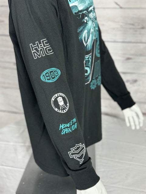 Celebrate the freedom of the ride with this men’s black long-sleeve t-shirt. The front showcases a bold "Home is the Open Road" design in striking teal and white, perfectly capturing the spirit of adventure. Coordinating sleeve graphics, including the iconic water tower and Bar & Shield silhouette, add a distinctive touch.
