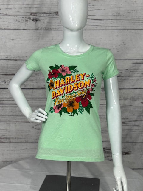 Turn up the heat with the Harley-Davidson® Women’s Tropics Tee — a bold burst of island attitude built for riders who crave sunshine and freedom. Set on a breezy mint green backdrop, this tee erupts with tropical florals and a punchy Harley-Davidson® logo that reads “Free Your Soul.” Lightweight and soft, it’s made for warm rides and wild escapes. The back brings it home with our exclusive Blue Ridge Harley-Davidson® winged logo in red — a statement of loyalty for free spirits with southern roots and serious style.