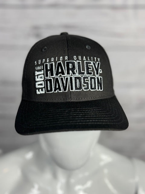 Top off your look with the men's "Upside" dealer hat. This cap features a sleek contrast white stitch design on the front, adding a touch of style and detail. The back showcases a subtle blackout dealer imprint, giving it a modern, understated edge. Perfect for everyday wear, this hat is a great way to show off your Harley-Davidson pride.