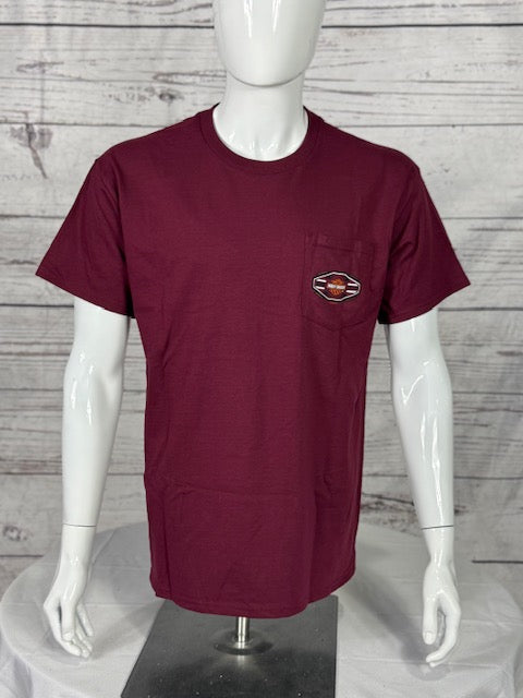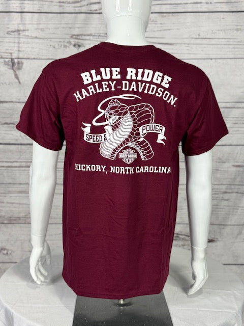 Clean cut meets full throttle in the Harley-Davidson® Men’s Victory Pocket Tee. This deep maroon short sleeve keeps it classic up front with a subtle Bar & Shield logo over the chest pocket — a nod to heritage with function. But the back doesn’t hold back, unleashing our custom Blue Ridge Harley-Davidson® design with a coiled cobra and bold “Speed & Power” banners. It’s rugged, straightforward, and made for riders who respect tradition but still ride with bite.