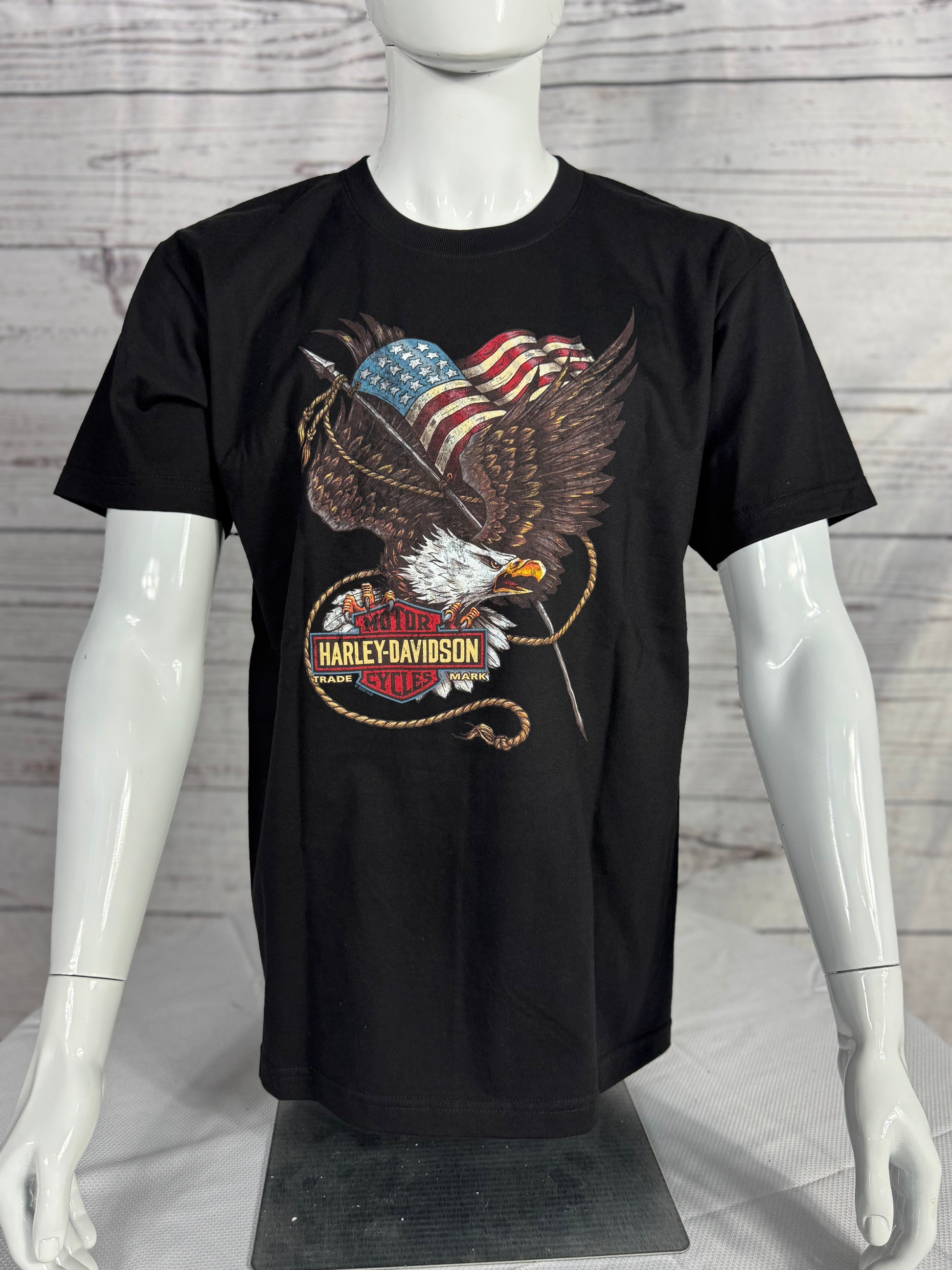 Honor timeless Harley-Davidson® heritage with the Men's Black USA-Made Vintage Eagle & Flag T-Shirt. This short-sleeve tee features a classic, distressed-style graphic of a majestic eagle soaring over the American flag, symbolizing freedom and pride. Crafted from soft, breathable cotton for all-day comfort, it’s perfect for any rider who appreciates old-school style. The back proudly showcases our custom Blue Ridge Harley-Davidson® logo, making this a must-have addition to your collection.