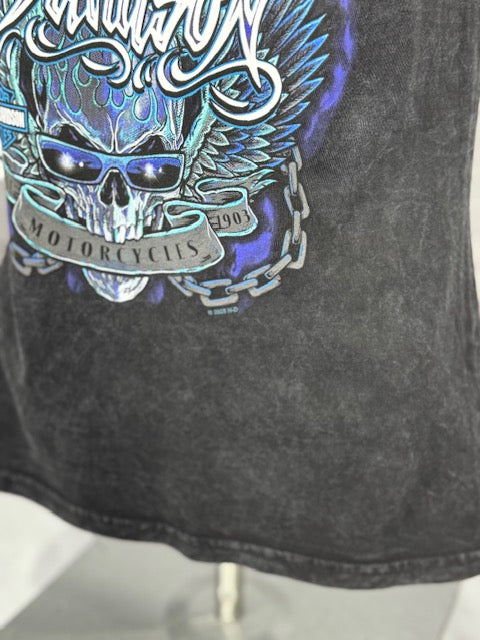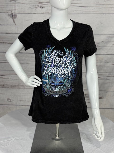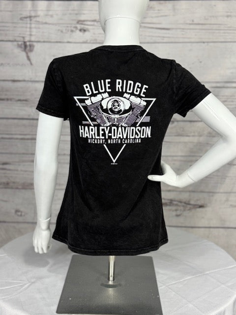 Unleash your inner rebel with the Harley-Davidson® Women’s Wild Child V-Neck Tee. This jet-black acid-washed tee delivers a high-voltage hit of style with a fierce skull and flames graphic, decked out in bold purples and blues, complete with chains, wings, and the iconic Harley-Davidson® script. The V-neck cut adds a flattering edge, while the back amps it up with our exclusive Blue Ridge Harley-Davidson® logo in Hickory, North Carolina. It’s wild, wicked, and built for the bold.