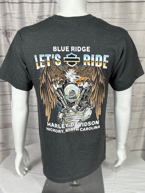 Keep it classic and bold with the Harley-Davidson® Men’s Willie G Skull Pocket Tee. The front features a small white Willie G Skull logo on the chest pocket, adding subtle edge to this charcoal gray essential. Turn it around, and the back explodes with attitude—our Blue Ridge Harley-Davidson® – Hickory, North Carolina exclusive “LET’S RIDE” design, featuring a fierce eagle gripping a V-twin engine. Made from durable cotton with a relaxed fit, this tee brings timeless Harley® grit and hometown pride to every ride.
