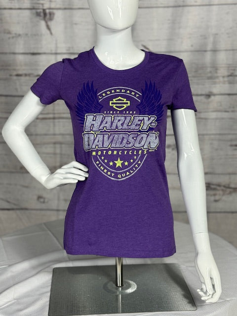 Brighten up your wardrobe with the Women's Wing Circle Short Sleeve T-Shirt, featuring an emboldened wing design with neon green accents across the front. The back showcases our custom Blue Ridge Harley-Davidson logo, adding a unique and stylish touch. Made from fun deep purple fabric, this t-shirt offers a vibrant and comfortable fit. Perfect for Harley-Davidson® enthusiasts, it combines striking visuals with casual comfort, making it an essential addition to your collection