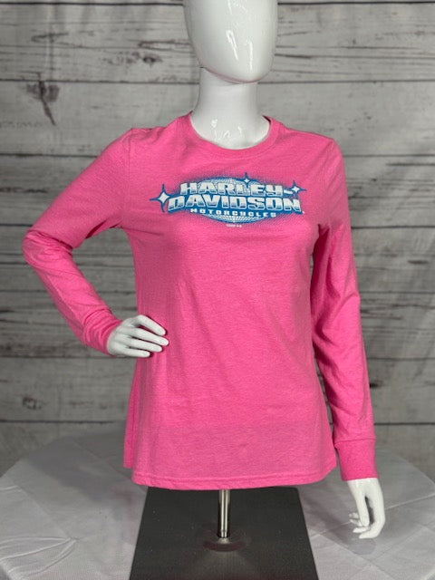 Own the road in the Harley-Davidson® Women’s World Wide Long Sleeve Tee. This sugar plum pink top brings a bold splash of attitude with a retro chrome-style Harley-Davidson® logo shimmering across the chest. Lightweight and vibrant, it’s made for year-round ride-or-die style. The back reps our exclusive Blue Ridge Harley-Davidson® V-twin triangle logo, giving it that hometown heat.